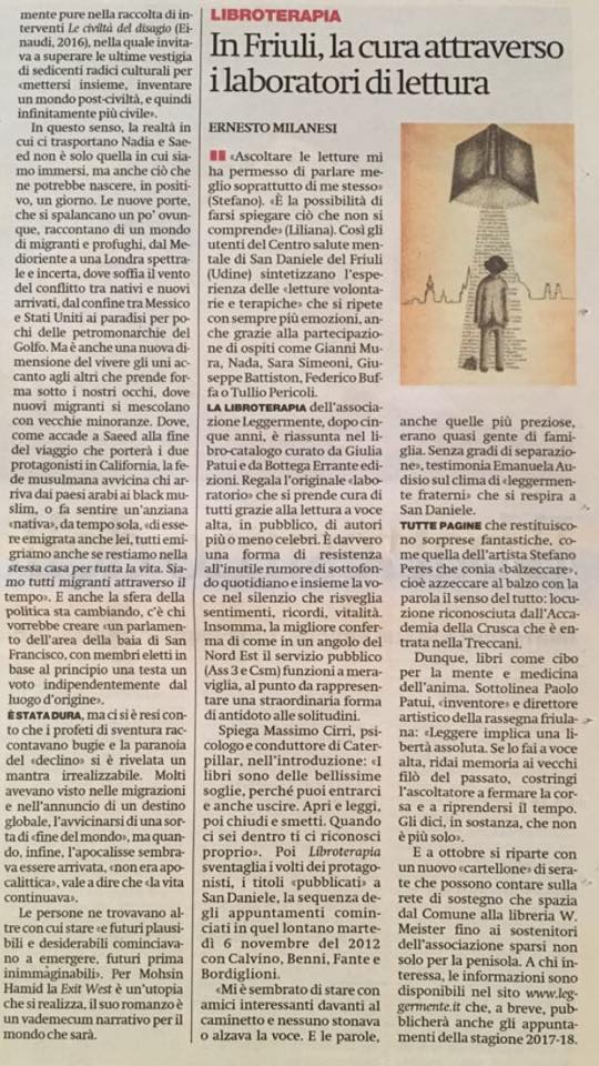 Si ricomincia quindi. Per il sedicesimo anno consecutivo. LeggerMente è quasi maggiorenne, ma ha già percorso molta strada e si porta dentro un bel bagaglio di libri, storie, volti, personaggi, anime. Si sale sul palco di LeggerMente non per una esibizione, semmai per un narrazione di sé, del proprio percorso esistenziale e professionale, in modo disinvolto, spontaneo, leggero. Stagione ricca questa non solo di serate tradizionali, ma anche di attività che provocano e interrogano un territorio. Dai martedì di lettura che ormai da otto anni LeggerMente tiene al Csm di San Daniele, all’iniziativa nuova del “libro in sospeso” che regalerà al lettore che vorrà un libro scelto in collaborazione con la libreria W. Meister, fino all’omaggio pieno di affetto (e di sorprese) dedicato ad Alberto Luchini, preside scuole medie sandanielesi, scrittore, e insospettabile illustratore. Ma la stagione nuova è alle porte con i suoi incontri, tutti folgoranti, diversi, emozionanti.